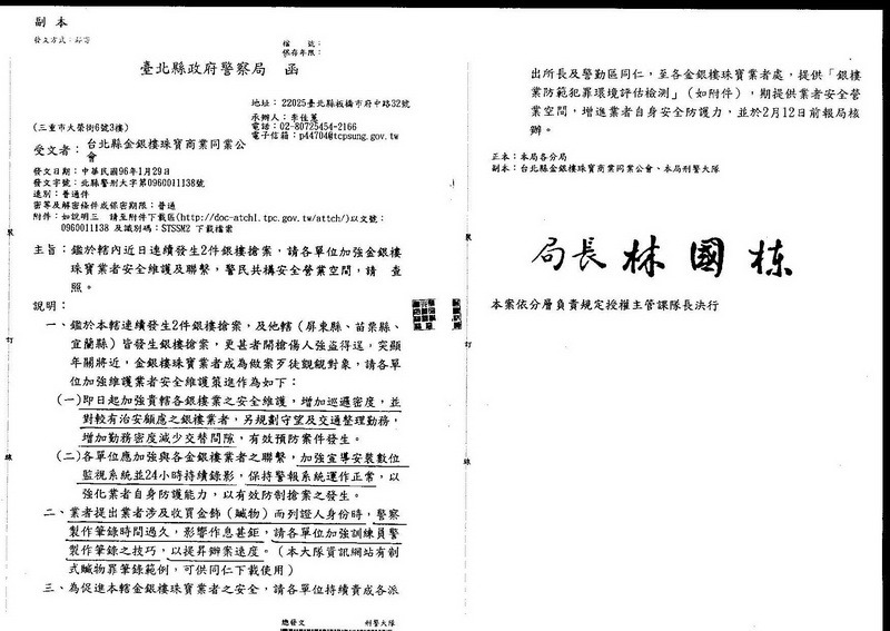 本會理事長陳少岩,名譽理事長邱文良,林永福及常務理事黃鴻基,歐明火,陳德國,常務監事張進鋒,及理事汪明秋,林正雄,監事駱進錄等於96年1月15日前往台北縣警察局拜會局長並商請對本業加強巡邏,防範宵小歹徒,以杜絕犯案,以維本業之生計;於96年2月1日接獲縣警局來函針對拜會所提之訴求.已要求輨區各分局員警加強我業者安全維護及聯繫;縣警察局來函全文請詳閱資料