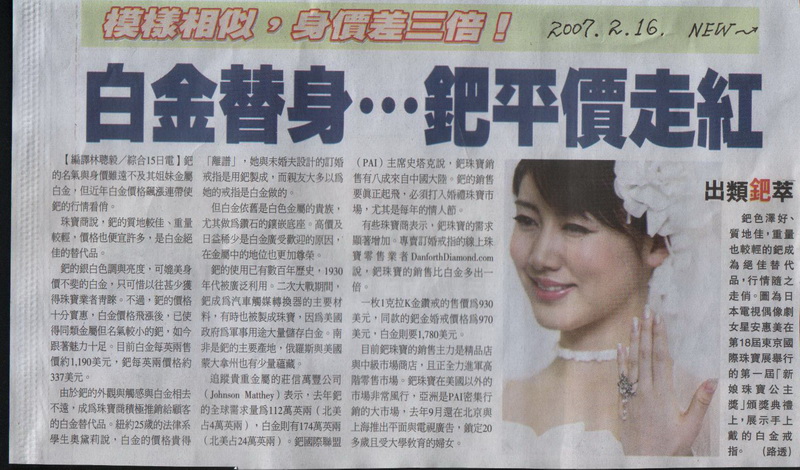 鈀色澤好,質地佳,重量也較的鈀成為白金絶佳替代品,行情隨之走俏;圖為日本電視偶像刻女星安惠美在第18屆東京國際珠寶展舉行的第一屆[新娘珠寶公主獎]頒獎典禮上,展示手上戴的白金戒指.