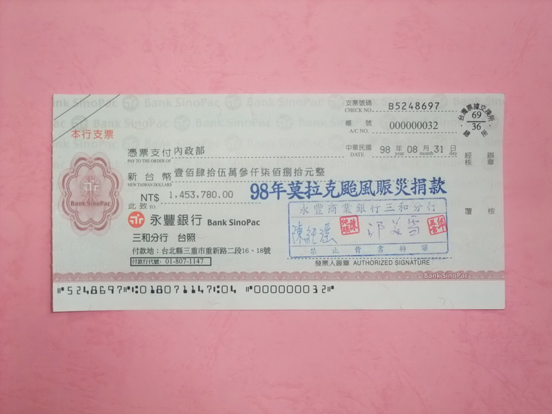 98年8月8日台灣南部遭受莫拉克颱風侵襲,產生土石流及山崩,使得甲仙,小林村等地遭受50年來最嚴重災害,本會基於人飢己飢人溺己溺的同胞愛精神,發起賑災捐款,獲得會員熱烈響應,共募集1,453,780元;於98年9月3日下午2時理事長張進鋒率常務理事歐明火,陳德國,李勇田,汪明秋,張耿煌, 名譽理事長邱文良及總幹事等前往內政部,由內政部常務次長簡太郎代表接受.