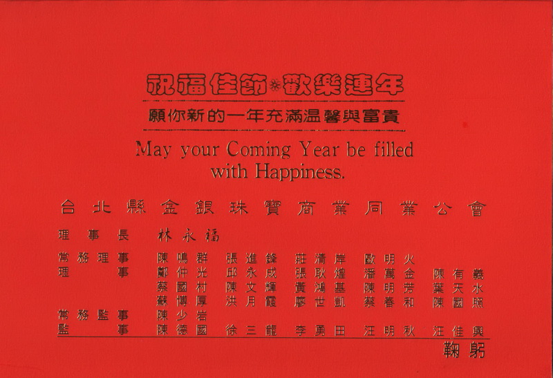 理事長暨全體理監事祝各位會員同業新年快樂,萬事如意,生意興隆,歲歲平安.